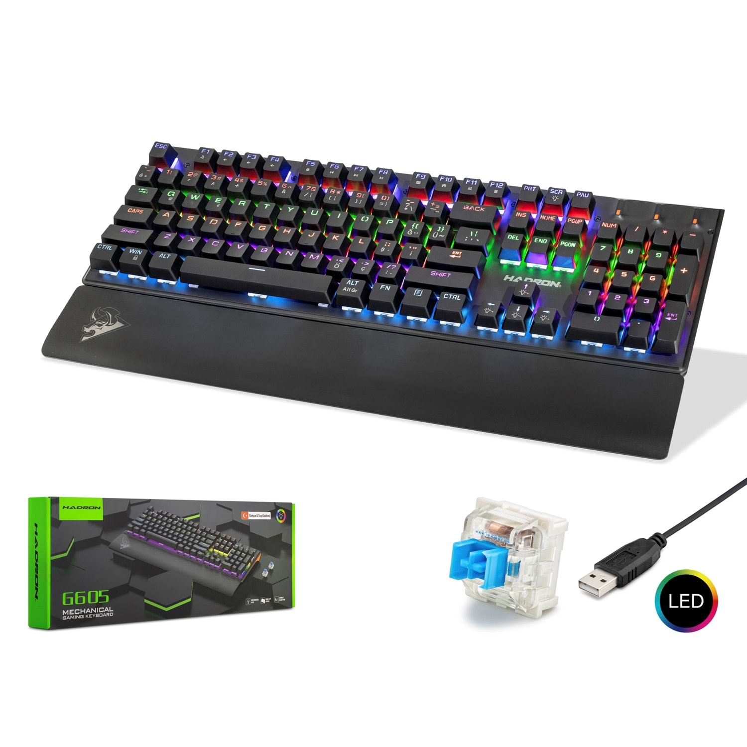 HADRON G605 gaming mekanik RGB klavye, Blue Switch tuş yapısına sahip kablolu oyuncu klavyesi modelidir. Mekanik switch yapısı sayesinde belirgin tuş hissi, hızlı tepki süresi ve yoğun kullanım için uygun tuş yapısı sunar. Oyun kullanımı, yazı yazma ve günlük bilgisayar kullanımı için uygun yapıdadır.