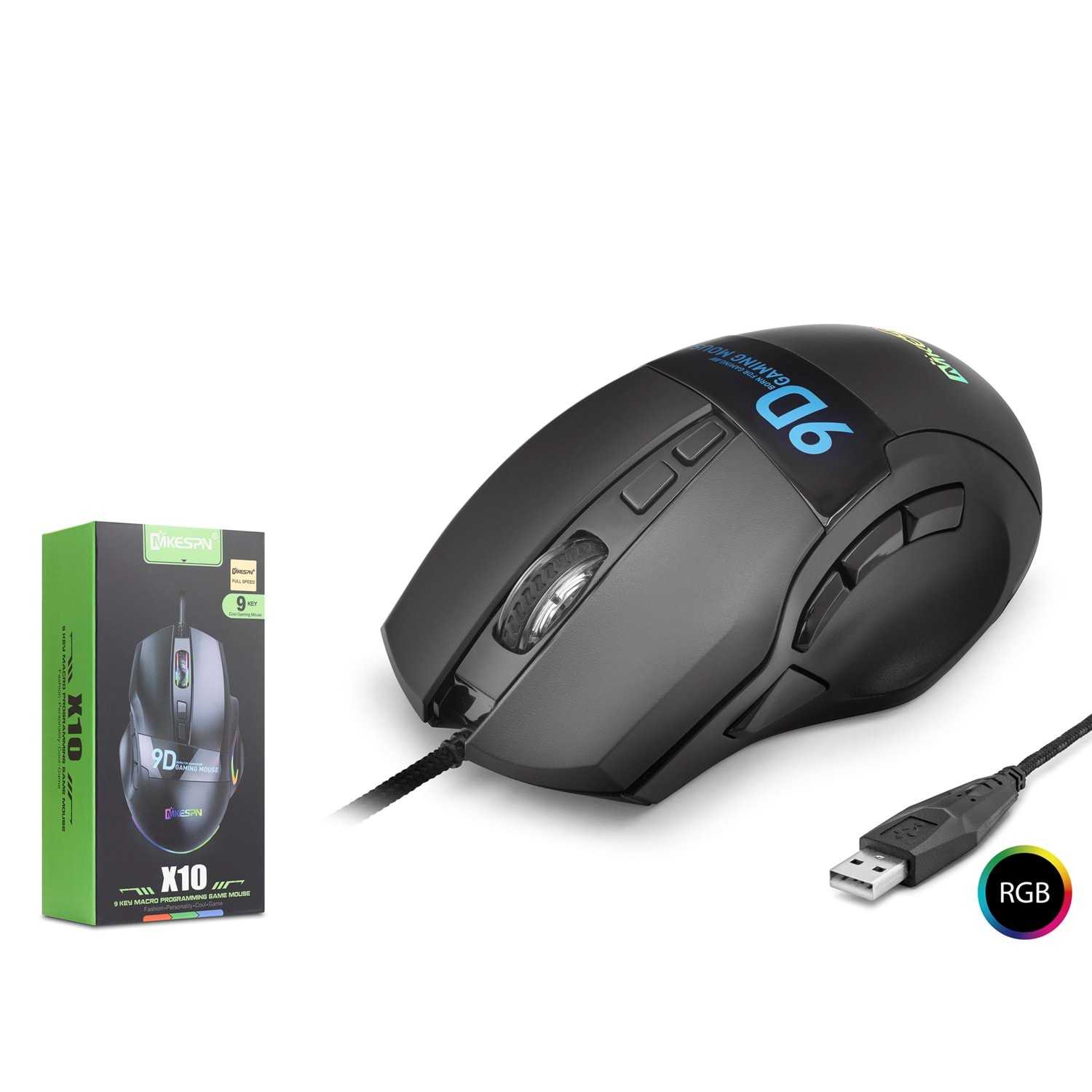 MKESPN X10 gaming mouse, USB kablolu bağlantı yapısı ile bilgisayar ve uyumlu cihazlarda kullanım sağlar. RGB aydınlatma ve ergonomik gövde yapısı ile masaüstü kullanımına uygundur.