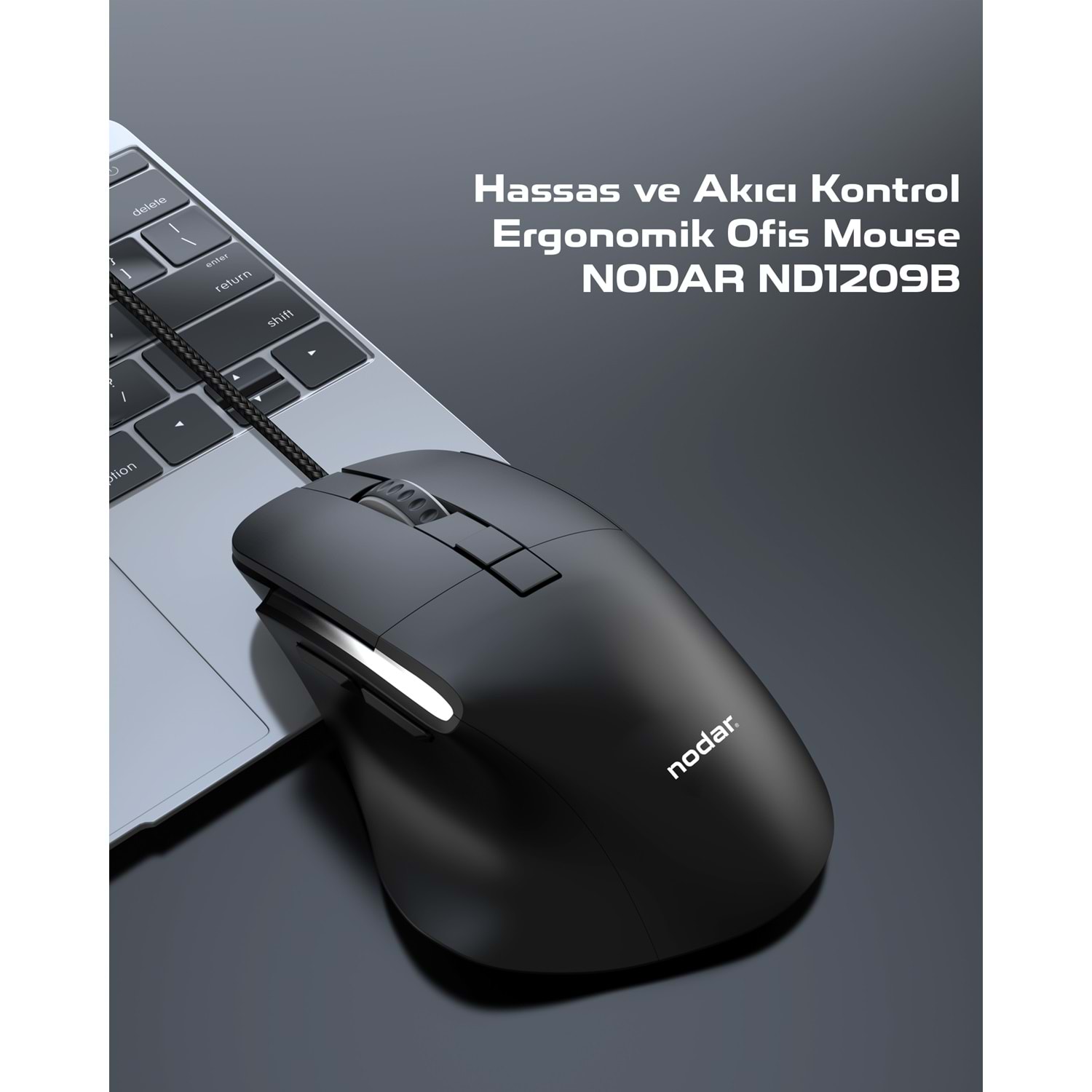NODAR ND1209B, gün boyu bilgisayar başında çalışan profesyoneller için özel olarak geliştirilmiş 7 tuşlu (7D) ergonomik bir ofis mouse'udur. El yapısına tam uyum sağlayan yüksek gövde yapısı, bilek yorgunluğunu minimize ederken hassas optik sensörü 3600 DPI'a kadar hız sunar. Dayanıklı 5 Milyon Tıklama ömürlü switchleri ve takılmaları önleyen 1.5 Metre Örgülü (Braided) kablosuyla hem uzun ömürlü hem de güvenilir bir çalışma arkadaşıdır.