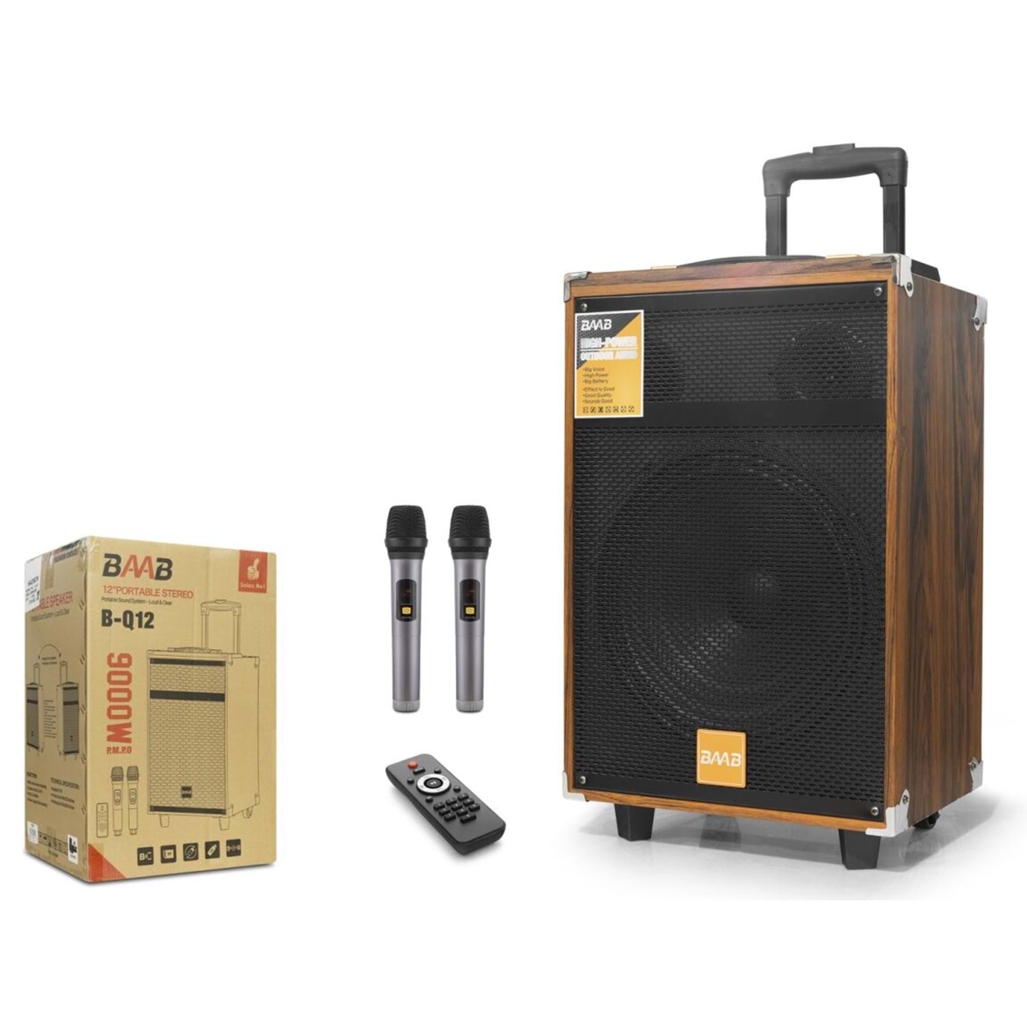 Kutu içeriğinde bulunan çift mikrofon sayesinde düetler yapabilir, uzaktan kumandası ile yerinizden kalkmadan tüm ayarları yönetebilirsiniz. Bluetooth bağlantısı, USB bellek, TF kart ve AUX girişleriyle tam donanımlı olan BQ-12, dahili şarj edilebilir bataryası sayesinde prize ihtiyaç duymadan eğlenceyi açık havaya veya istediğiniz her yere taşımanıza olanak tanır.