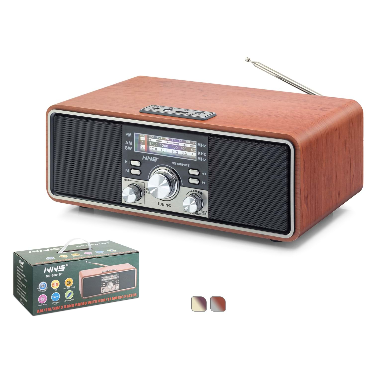 NNS NS6681BT, klasik radyo estetiğini modern dijital imkanlarla birleştiren, 30 cm genişliğinde doyurucu bir akustik hacme sahip nostaljik ses sistemidir. Yüksek kaliteli ahşap görünümlü kasası ve retro kontrol düğmeleriyle bulunduğu ortama antika bir zarafet katarken, güncel Bluetooth 5.0 teknolojisiyle akıllı cihazlarınızdan kesintisiz müzik akışı sağlar.
