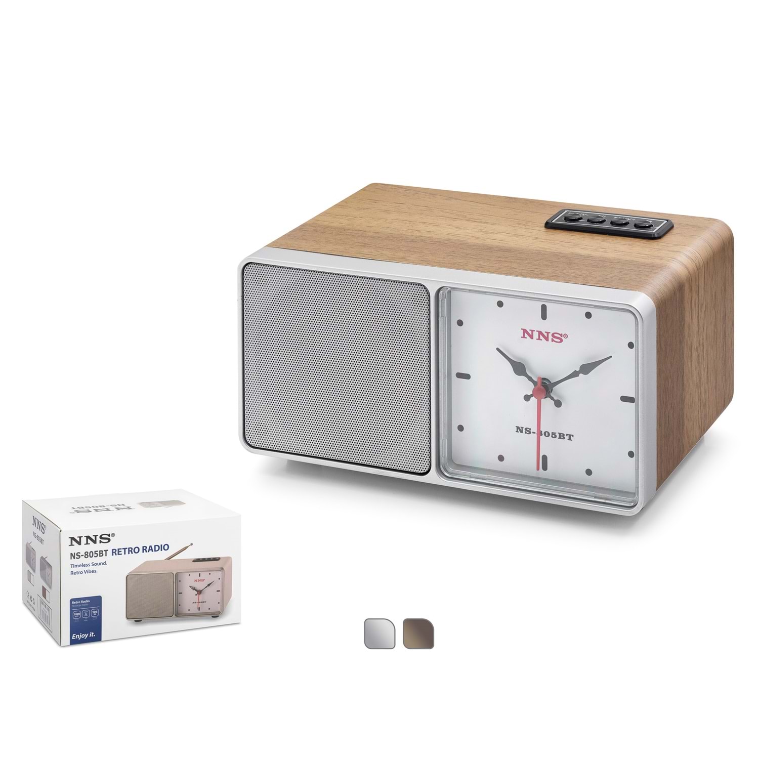 NNS NS805BT, klasik masa saati estetiğini modern ses teknolojisiyle birleştiren, 19.5 cm genişliğinde özel bir nostaljik ses sistemidir. Ön panelinin yarısını kaplayan geniş analog saati ve ahşap dokulu zarif gövdesiyle bulunduğu her ortama vintage bir zarafet katarken, güncel dijital özellikleriyle çok yönlü bir kullanım sunar.