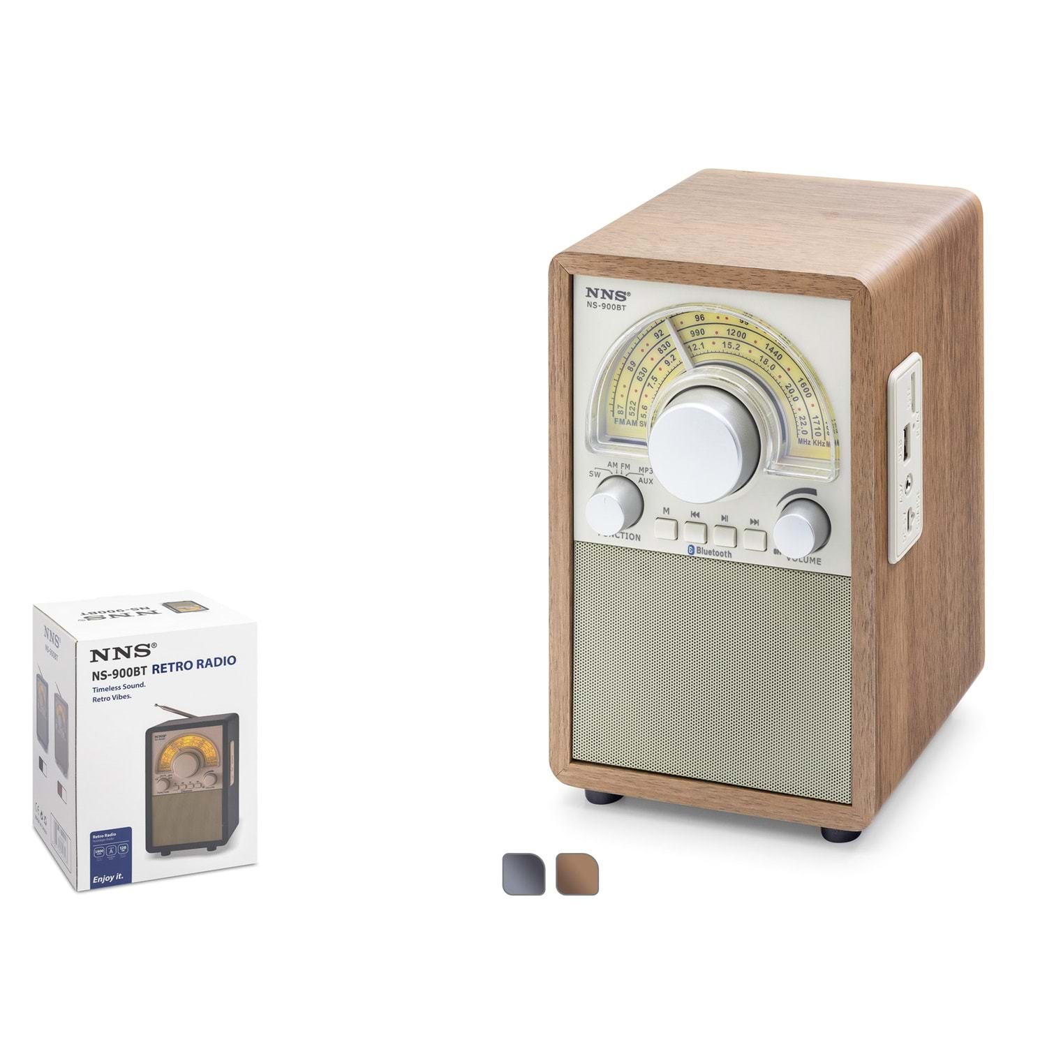 NNS NS900BT, klasik kule tipi radyo estetiğini modern dijital özelliklerle yeniden yorumlayan, dikey kasa yapısına sahip özel bir ses sistemidir. Ahşap dokulu zarif gövdesi ve ön paneldeki karakteristik dairesel frekans kadranıyla bulunduğu her ortama vintage bir zarafet katarken, güncel ses teknolojisiyle yüksek kaliteli müzik deneyimi sunar.