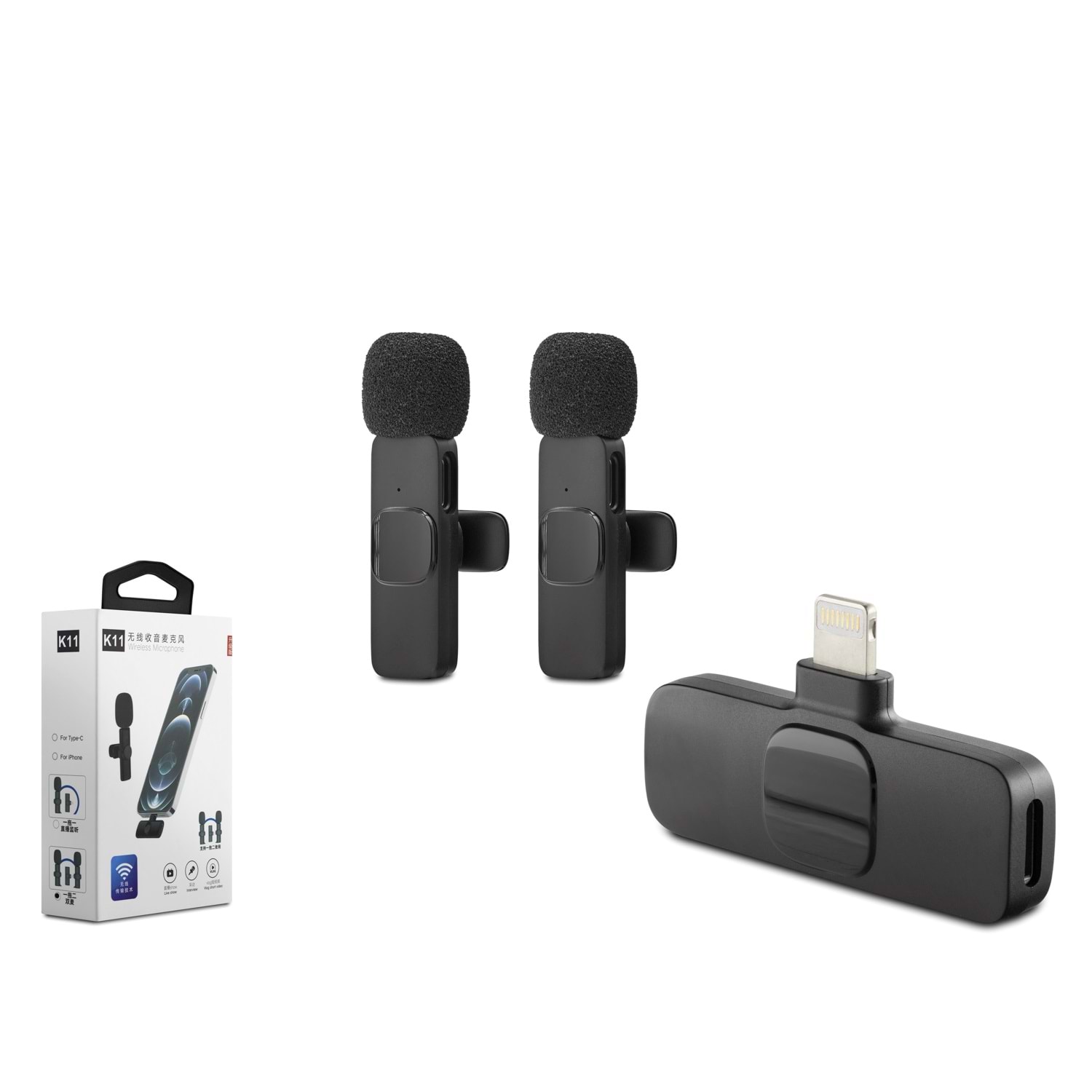HADRON K11 HDX2784 Kablosuz Yaka Mikrofon Seti, Lightning bağlantı yapısına sahip uyumlu cihazlarda ses kaydı, video çekimi, röportaj, canlı yayın ve mobil içerik üretimi için kullanılabilen kablosuz mikrofon çözümüdür. Çift mikrofon yapısı sayesinde iki farklı ses kaynağı aynı anda kayıt edilebilir.