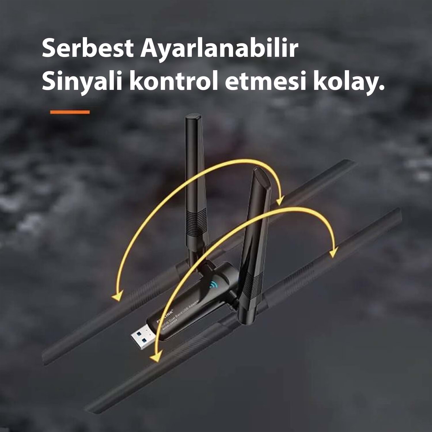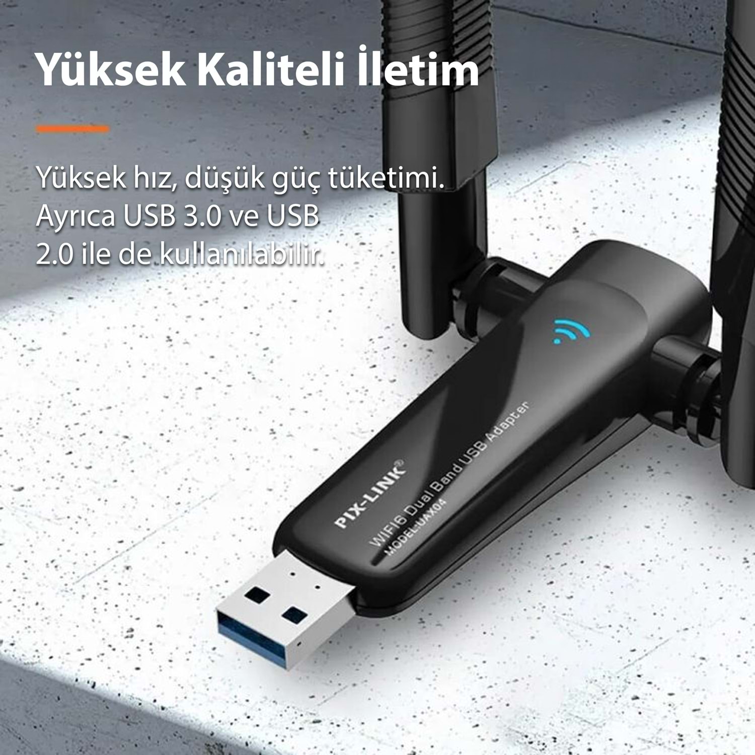 Ürün WiFi 6 kablosuz ağ standardını destekler ve 2.4 GHz ile 5 GHz bantlarında Dual Band kullanım sunar. 2 adet harici antenli USB 3.0 yapısı ile daha kararlı bağlantı ihtiyacı bulunan kullanım alanlarında kullanılabilir. Kullanıcı bilgisine göre AIC8800D çipset yapısına sahiptir, MU-MIMO desteği sunar ve uyumlu sistemlerde tak çalıştır kullanım desteği sağlar.